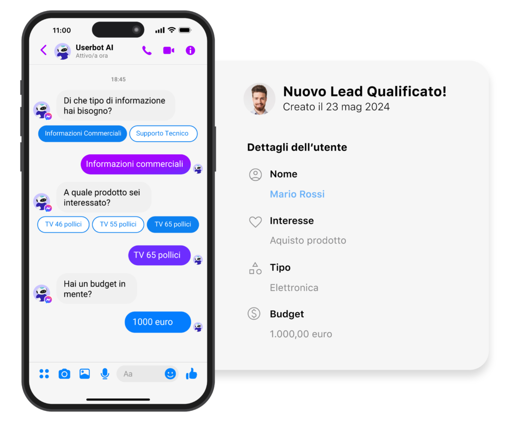 Userbot.AI si integra con Messenger, consentendo a più operatori di gestire le chat e consultare lo storico delle conversazioni in caso di necessità. I tuoi team saranno in grado di collaborare aumentando l’efficienza della tua azienda.
