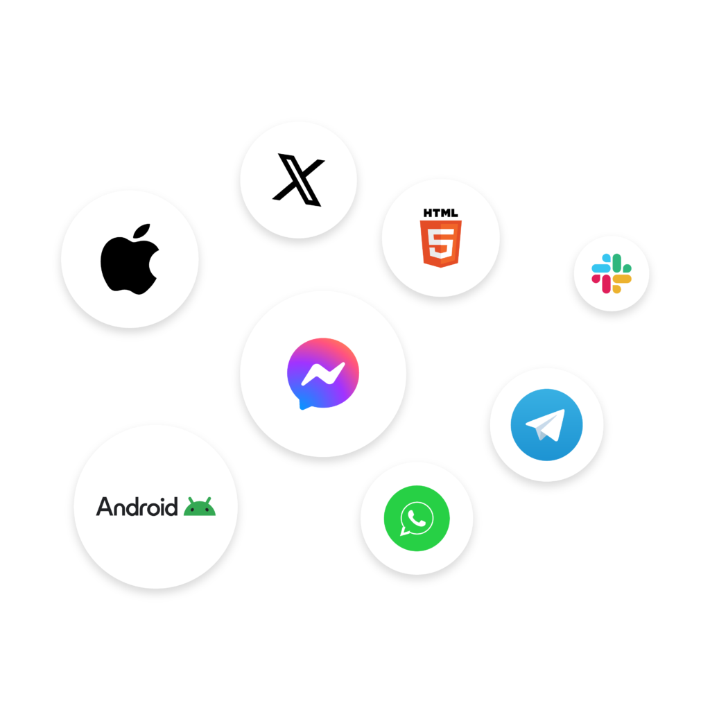 Una volta creato il tuo chatbot, potrai distribuirlo su tutti i canali preferiti dai tuoi clienti, fornitori o collaboratori: WhatsApp, Messenger, Web, App Mobile, Telefono e Totem.